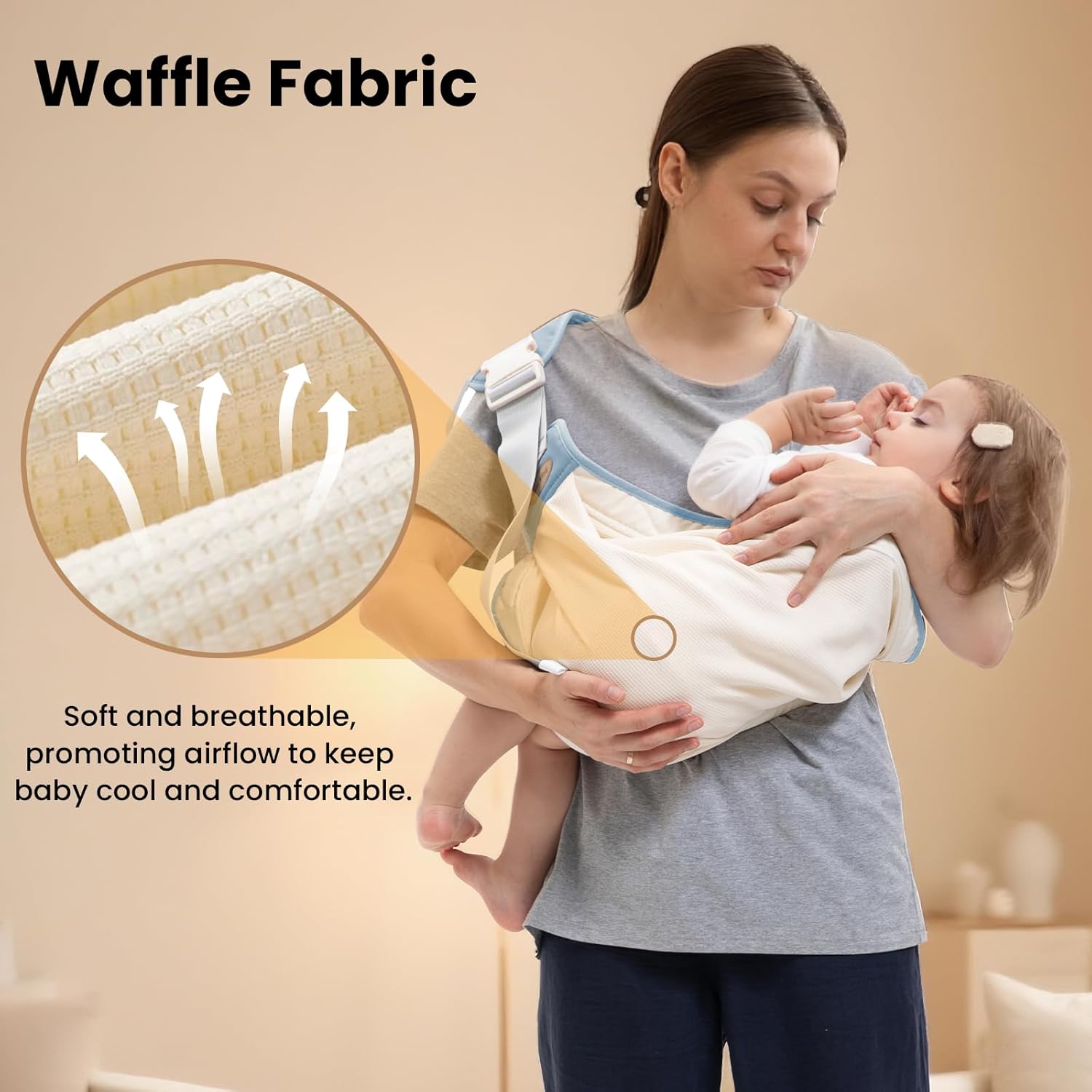 - 【Designed for Comfort & Safety】Reinforced buckles and soft padded edges ensure secure support without pinching or chafing. The baby sling carrier’s waffle-knit lining provides cloud-like comfort against your baby’s skin, perfect for all-day wear during walks or travel.