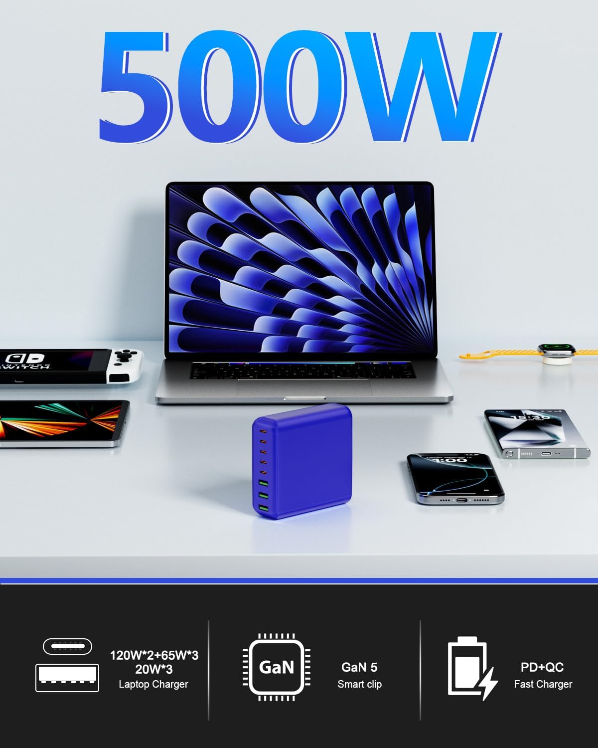 500W USB C Charger Block, 8-Port USB C Charging Station Fast Charging PD 120W PC Laptop Charger Adapter Compatible with MacBook Pro/Air/All iPad,DELL, iPhone 16/15/14/13/Pro Max/Galaxy