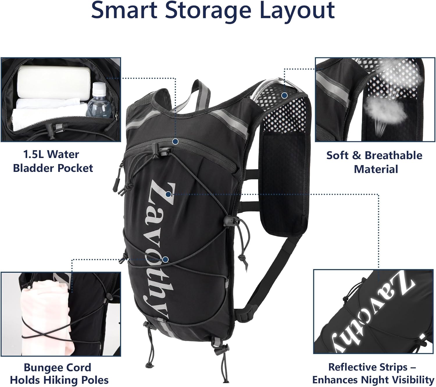 Zavothy Hydration Running Vest for Men & Women β Lightweight 1.5L Hydration Pack with Phone Pockets, Water Bottle Holders, Reflective Strips, Rain Cover β Trail Running, Cycling, Marathon