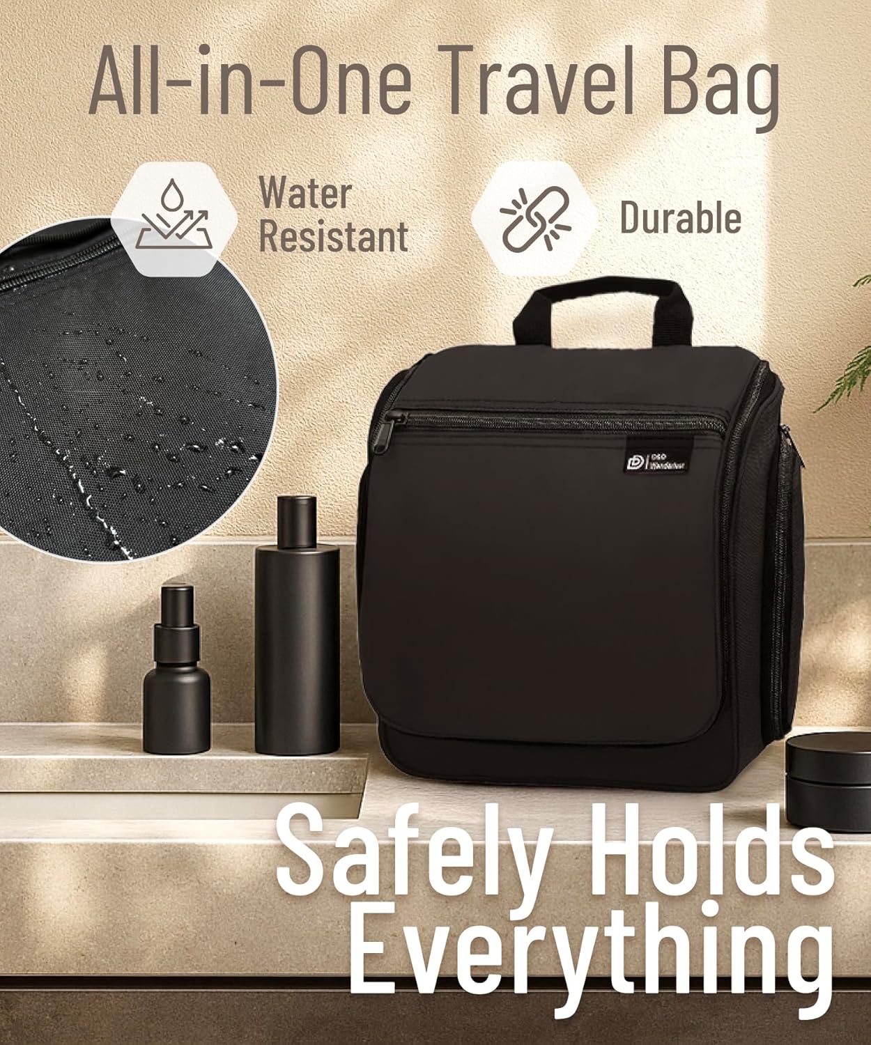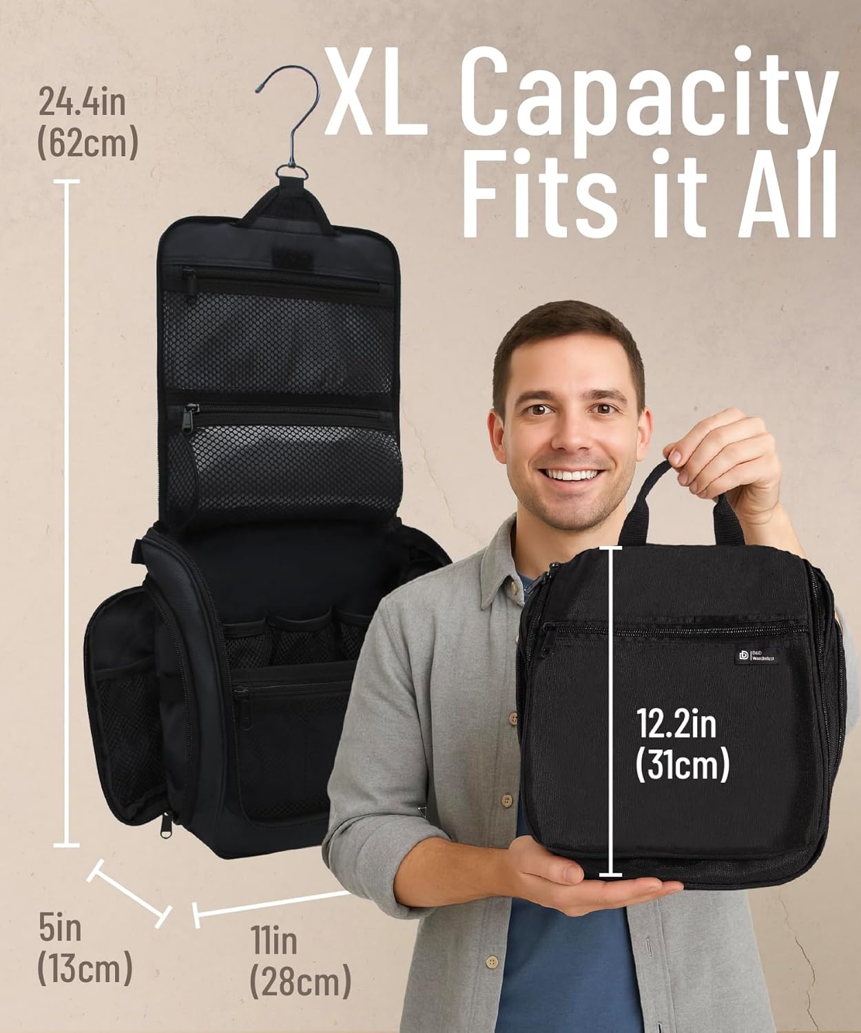 - HANGING HOOK:: The XXL metal swivel hook allows you to hang the bag anywhere, saving valuable counter space. It's perfect for use in hotels, bathrooms, or even on a camping trip.