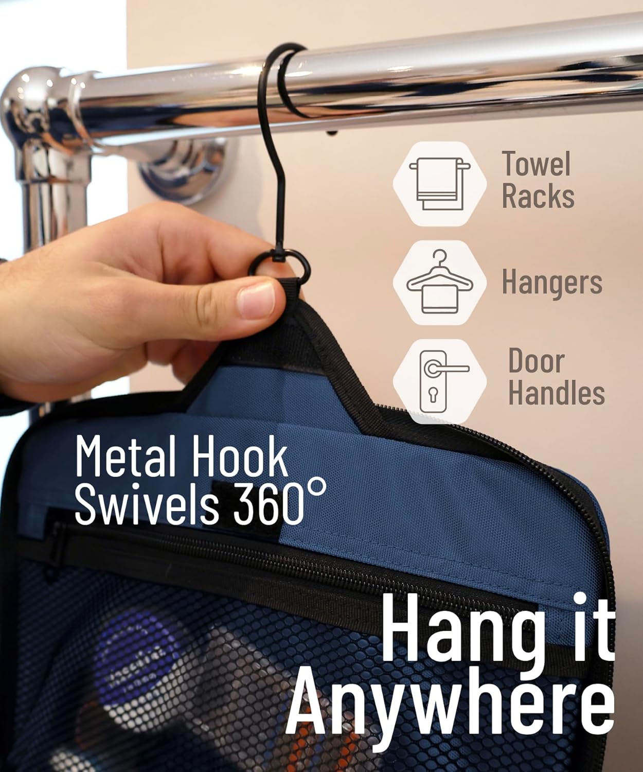 - HANGING HOOK:: The XXL metal swivel hook allows you to hang the bag anywhere, saving valuable counter space. It's perfect for use in hotels, bathrooms, or even on a camping trip.