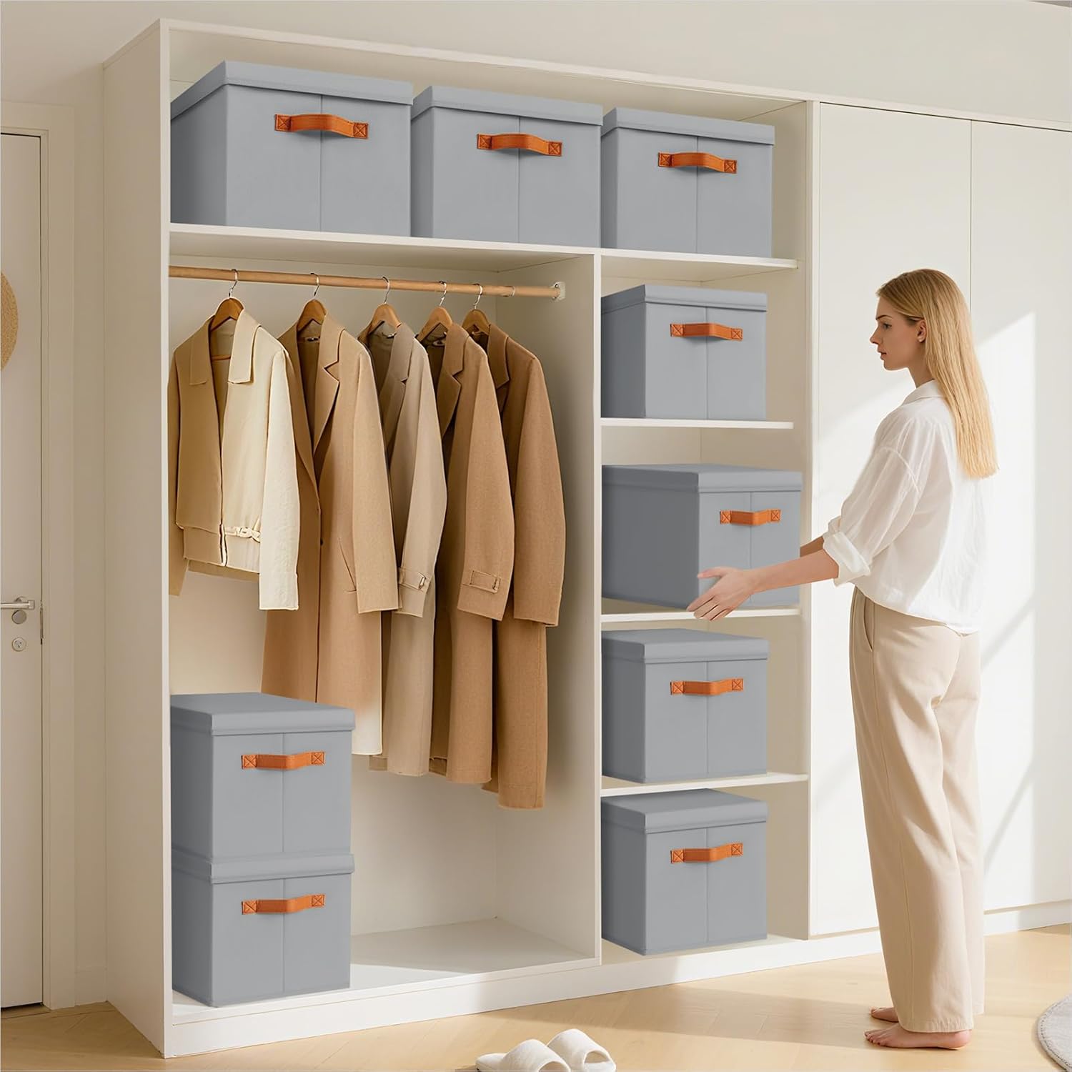 Storage Bins with Lids - Large Fabric Closet Bins with Lid, 6 Pack Clothes Organizers and Storage, Collapsible Stackable Cube Basket for Home, Office, Dorm, Grey