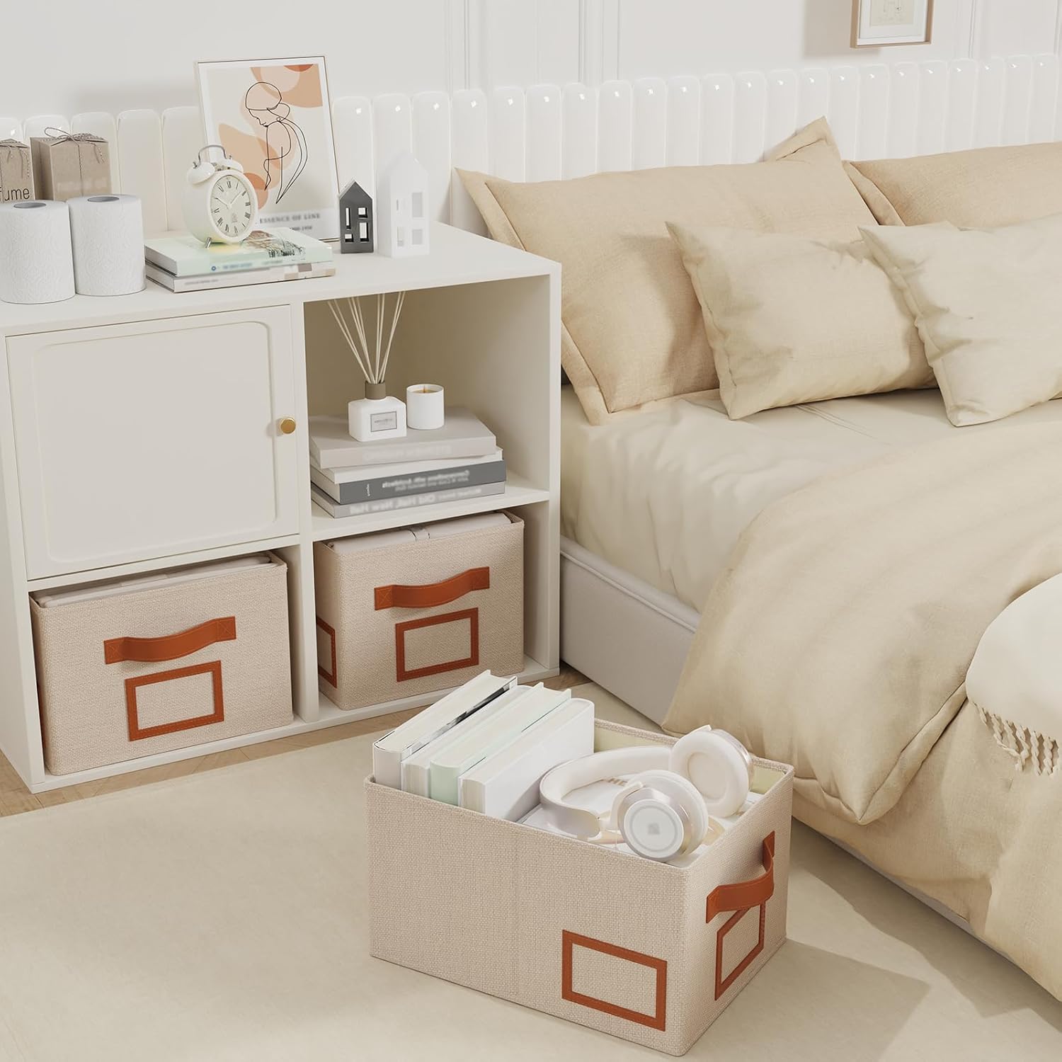 OUTBROS Foldable Storage Box for Shelves, 15.7 x 11.8 x 7.9 inch Fabric Baskets, Wardrobe Organiser with Handles, Suitable for Storing Clothes, Books, Cosmetics (Beige, 3-Pack)