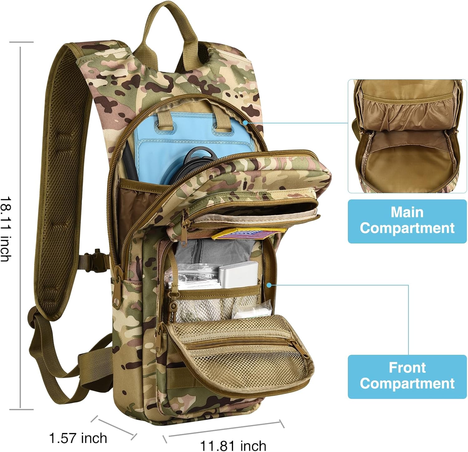 - Rugged Camo Exterior for Outdoor Use – Built with high-density 900D nylon, this hydration backpack is engineered to resist scratches, tears, and abrasion. The military-inspired design not only looks tactical but also blends well into natural surroundings, making it a reliable companion for hiking, camping, or survival training.