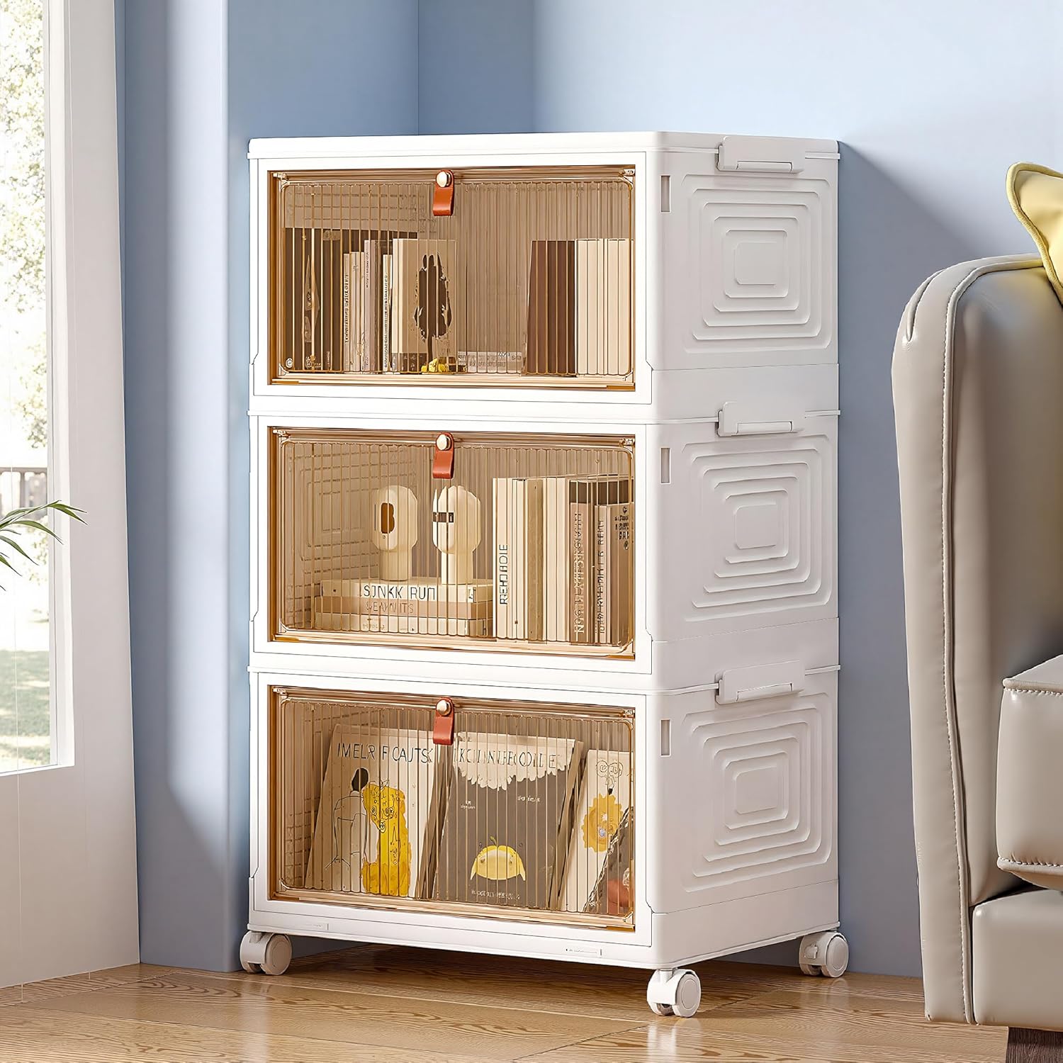 VECELO 3 Tier Stackable Storage Boxes with Magnetic Doors & Wheels, Foldable Storage Containers, 23 QT Closet Organizers for Living Room, Office, Dorm